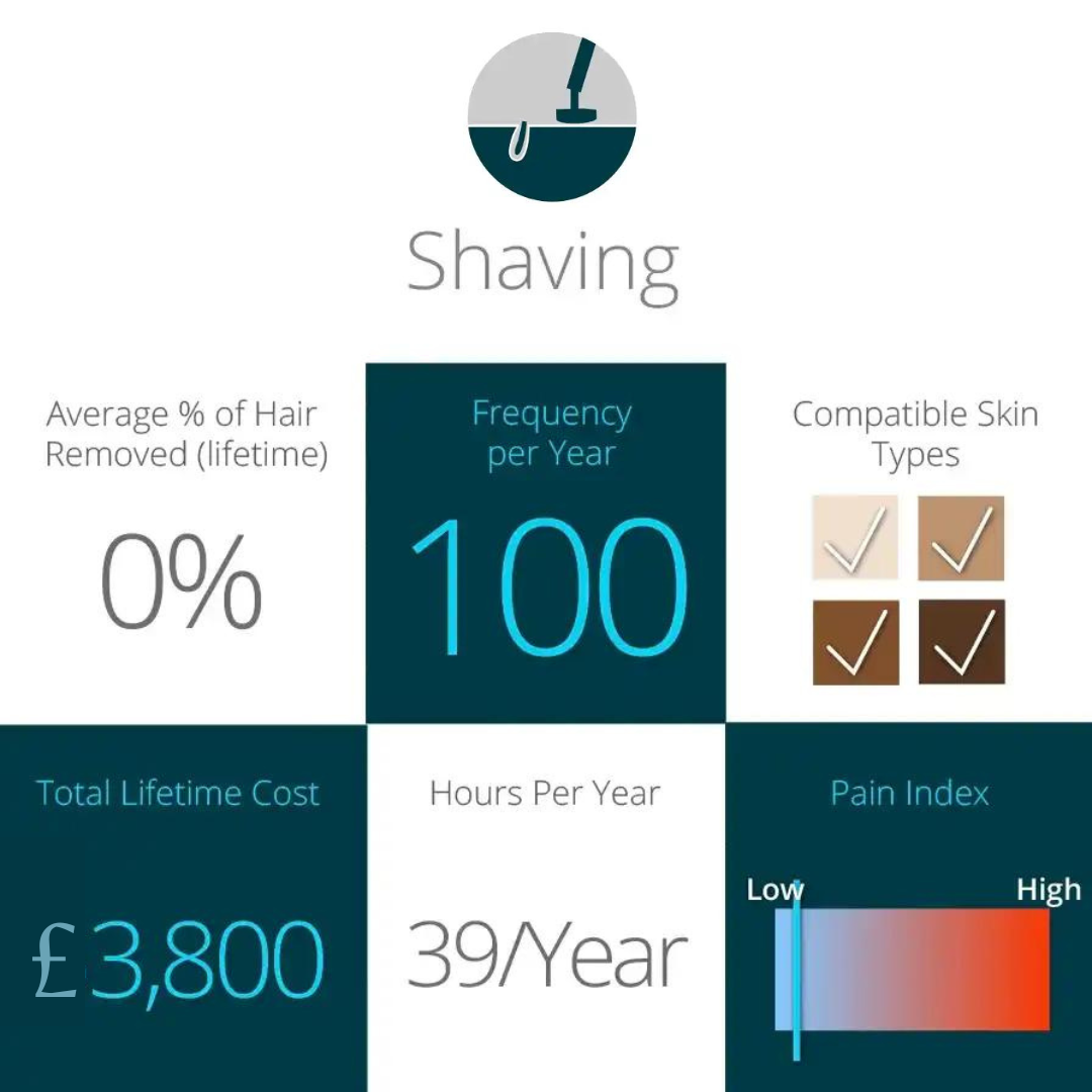 In this comparison its easy to see that in the long run it’s a lot cheaper to have laser. But more importantly the time you will save by not shaving is huge, so will ultimately give you more time over the years ahead.